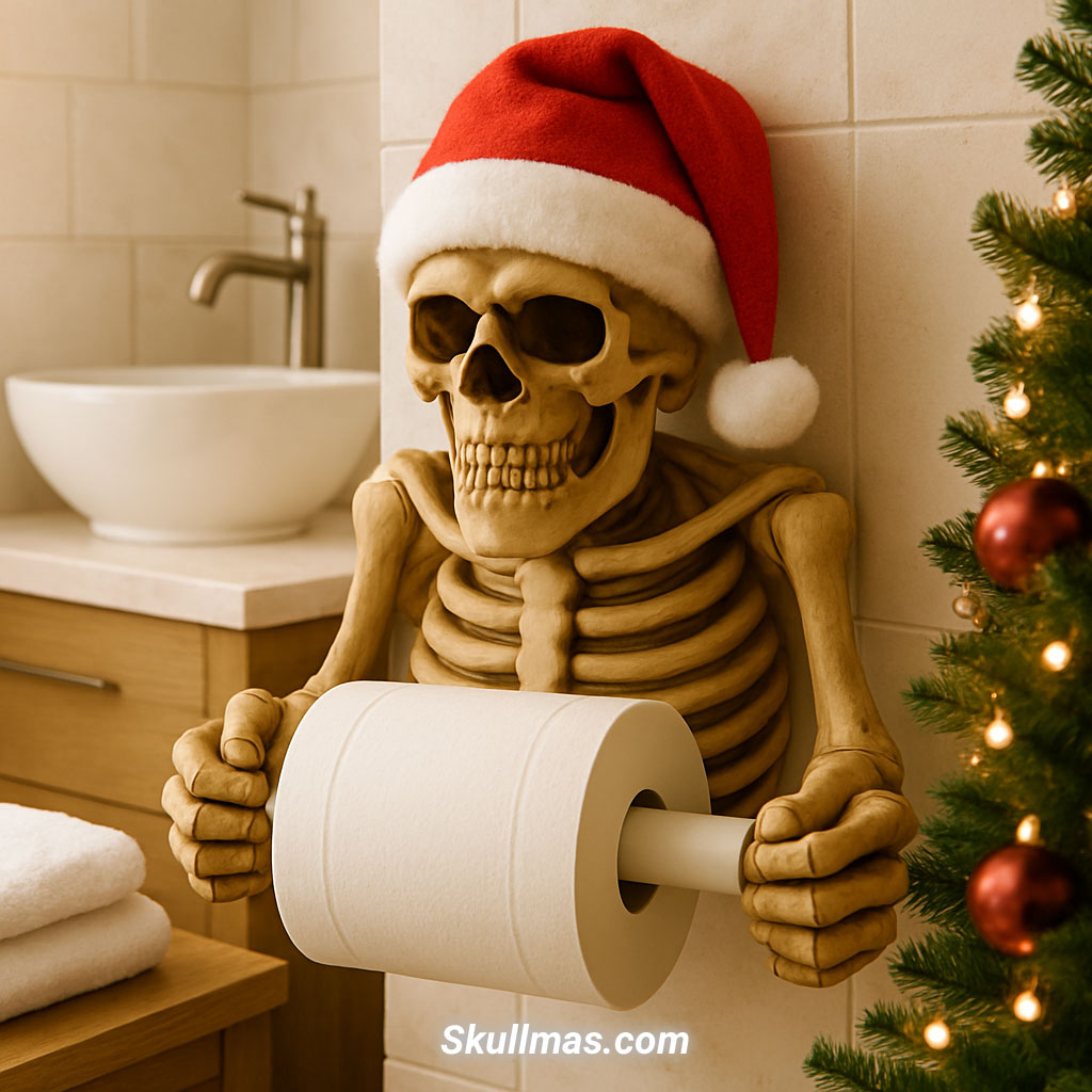 What I love most is how unexpected it is. You don’t usually think of skeletons when you think of Christmas — unless you live in my world — but the little elf Santa hat totally transforms him into this cute, jolly little holiday helper who also happens to hand you the toilet paper. Iconic behavior, honestly.